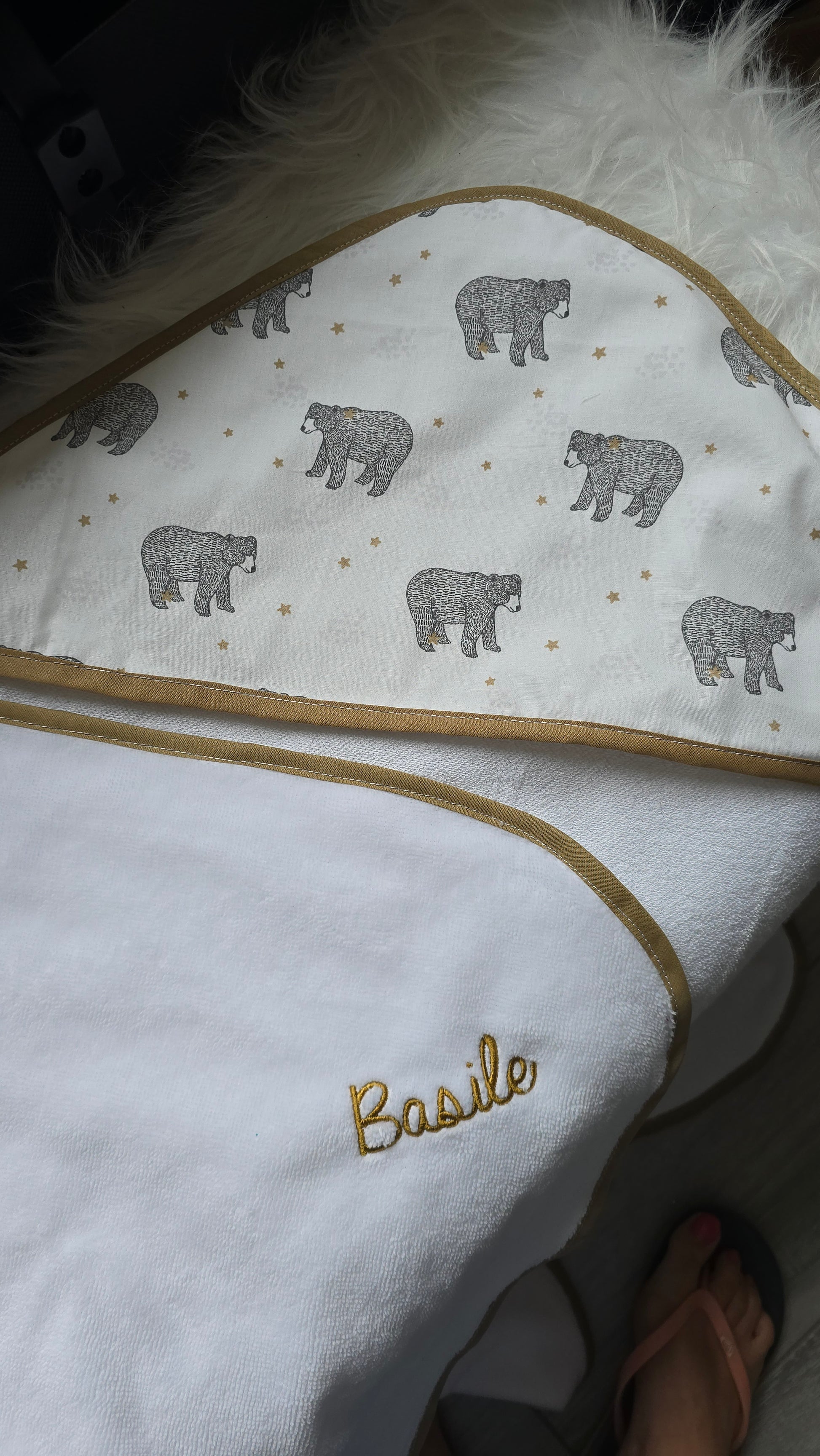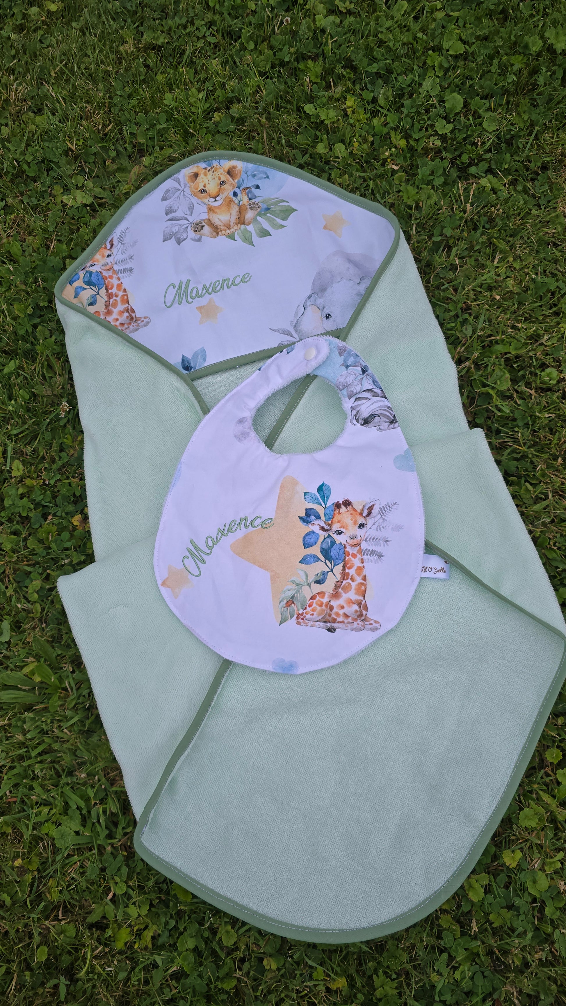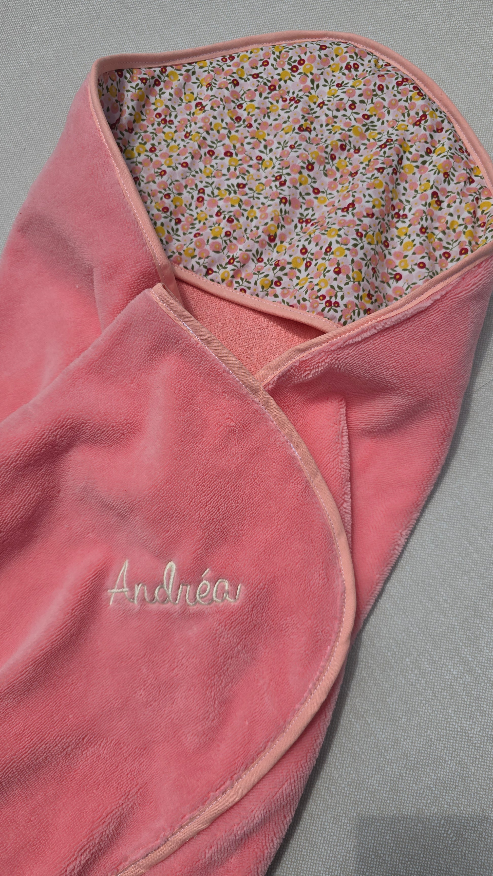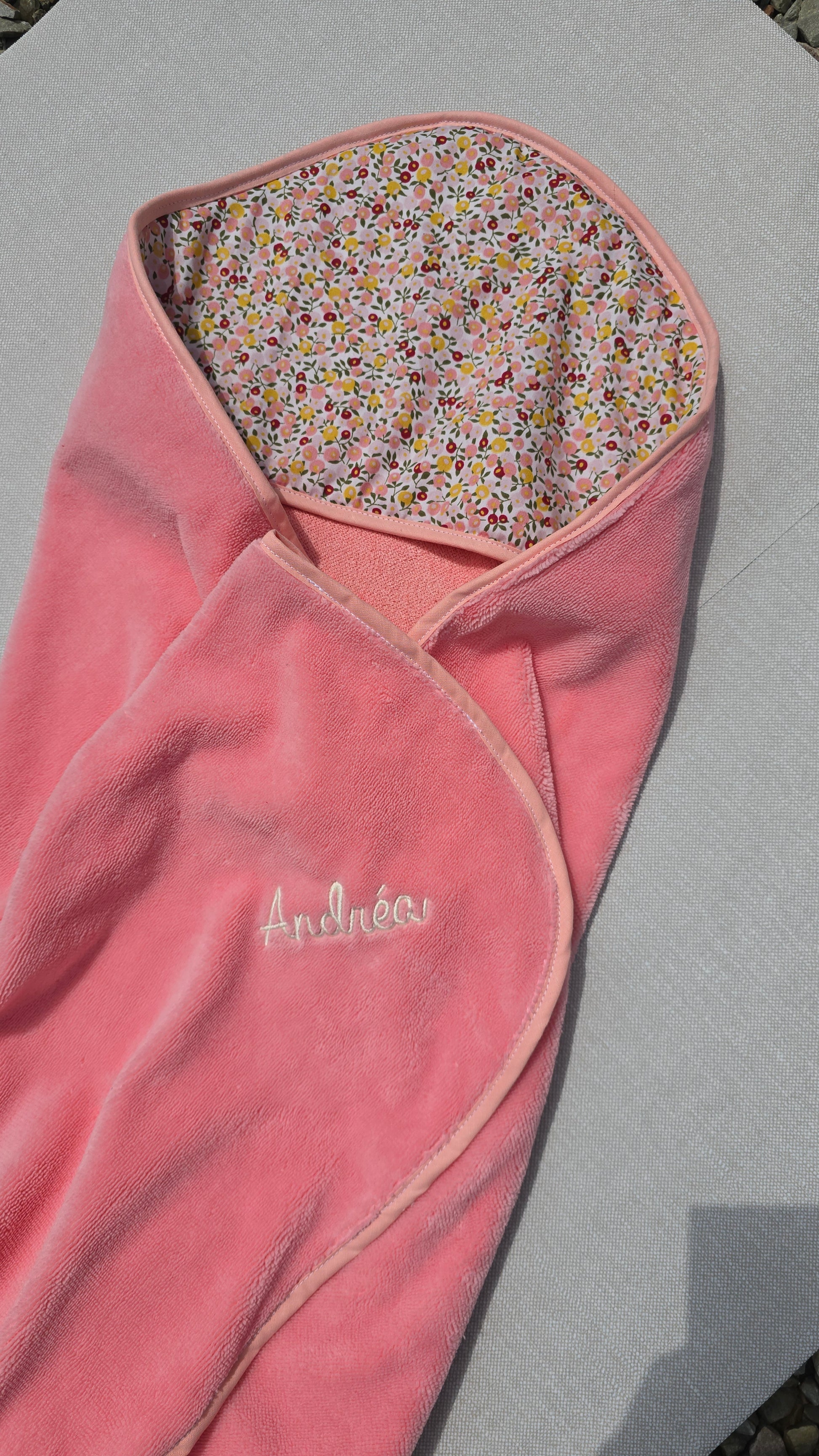 Vous choisissez le tissu de la capuche, l’éponge bambou, et pouvez faire broder le prénom de l’enfant ou un petit mot doux.
