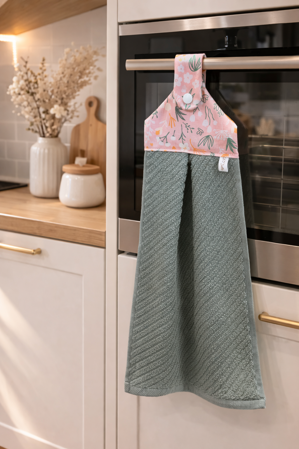 Grâce à sa patte pressionnée, il se fixe facilement à la poignée du four ou d’un meuble, et reste bien en place.